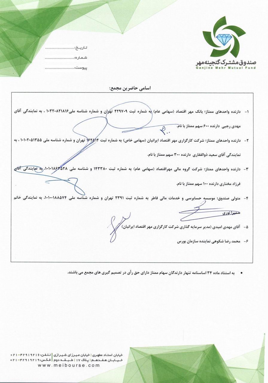 لیست حاضرین در مجمع صندوق سرمایه گذاری مشترک گنجینه مهر مورخ 1399/05/13 (تمدید دوره فعالیت صندوق)