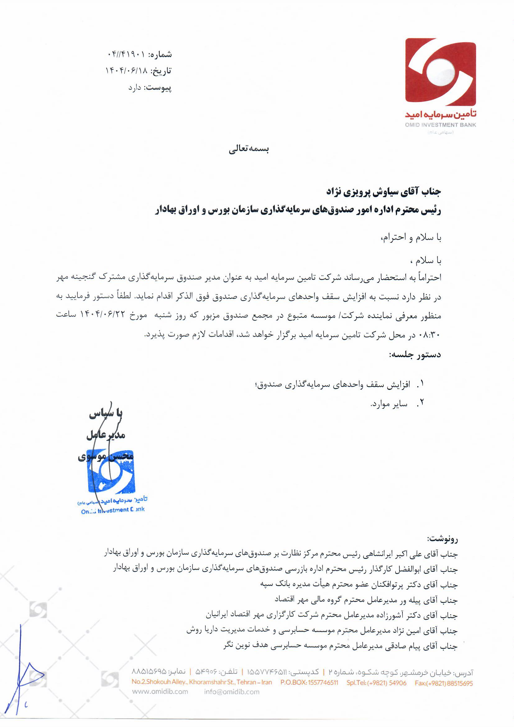 آگهی دعوت به مجمع صندوق گنجینه مهر مورخ 22-06-1404 روز شنبه ساعت 08:30 صبح ( افزایش سقف)
