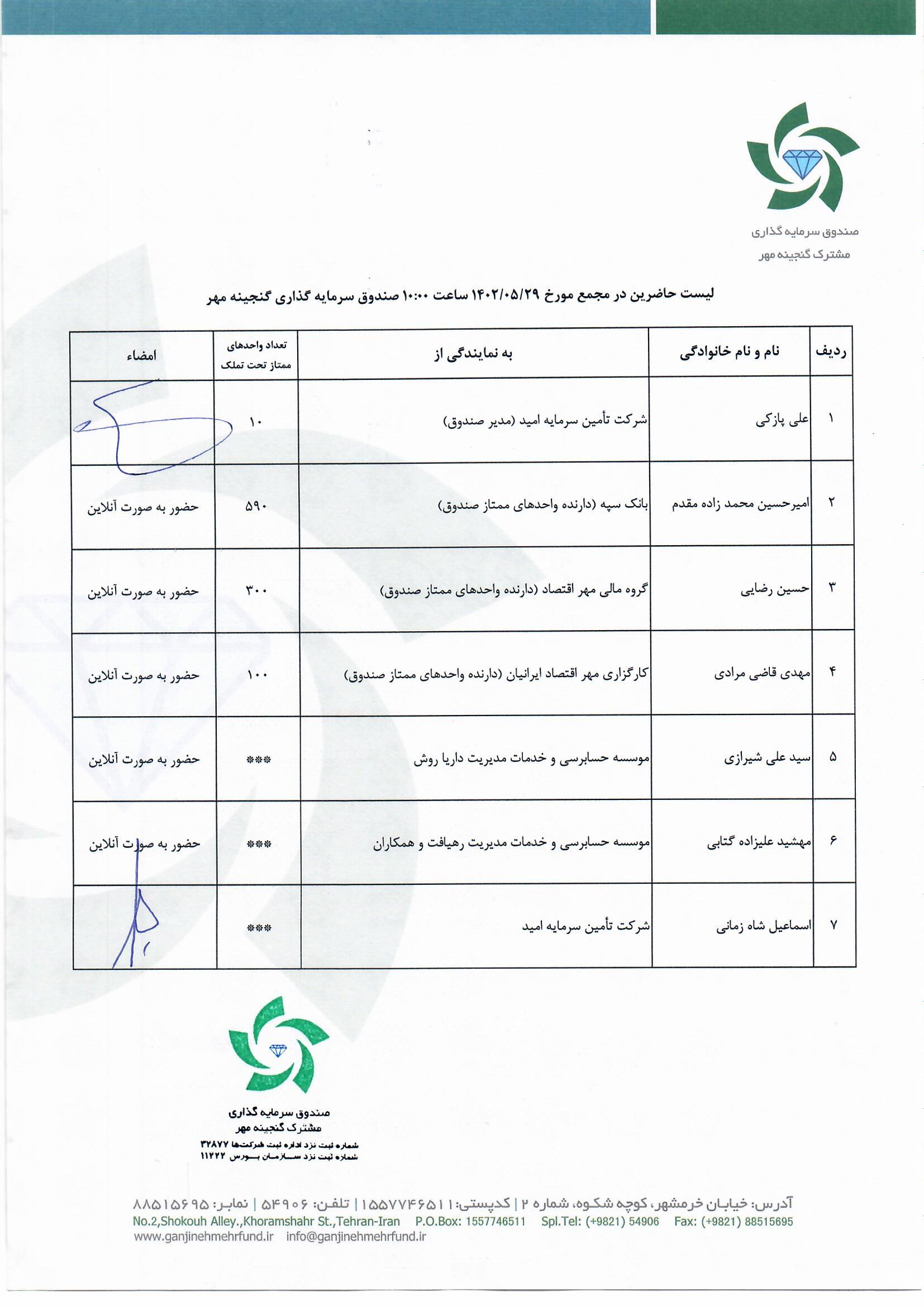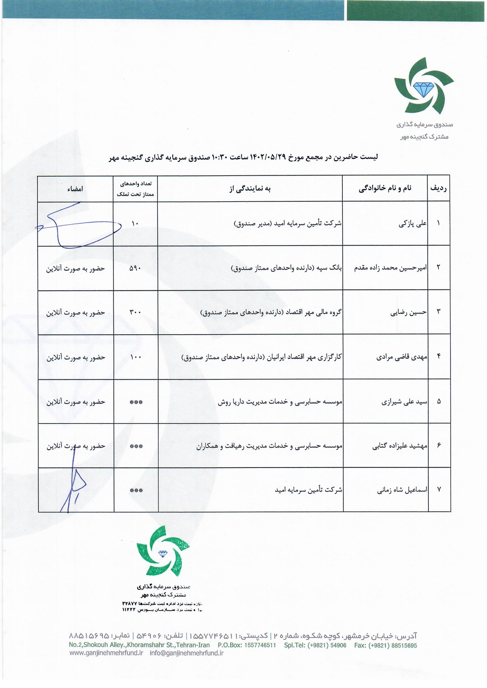 لیست حاضرین مجمع صندوق سرمايه گذاري مشترک گنجینه مهر مورخ ۱۴۰۴/۰۷/۲۶ شنبه ۰۸:۳۰ ( تغيير محل قانونی صندوق)